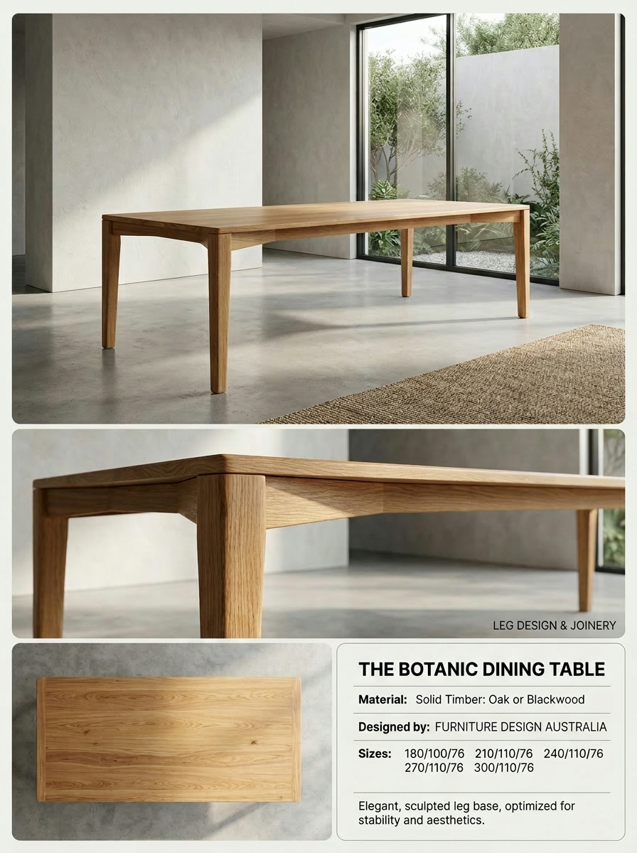 Crafted from exquisite solid oak and opulent Blackwood timber, each Botanic dining table is a masterpiece, meticulously designed with premium materials that not only ensure exceptional durability but also highlight the stunning natural grain patterns of the wood. The rich hues and intricate textures of these tables bring an air of sophistication and warmth, effortlessly transforming your dining area into a welcoming sanctuary, whether you are enjoying a laid-back family meal or hosting a lavish dinner soirée.