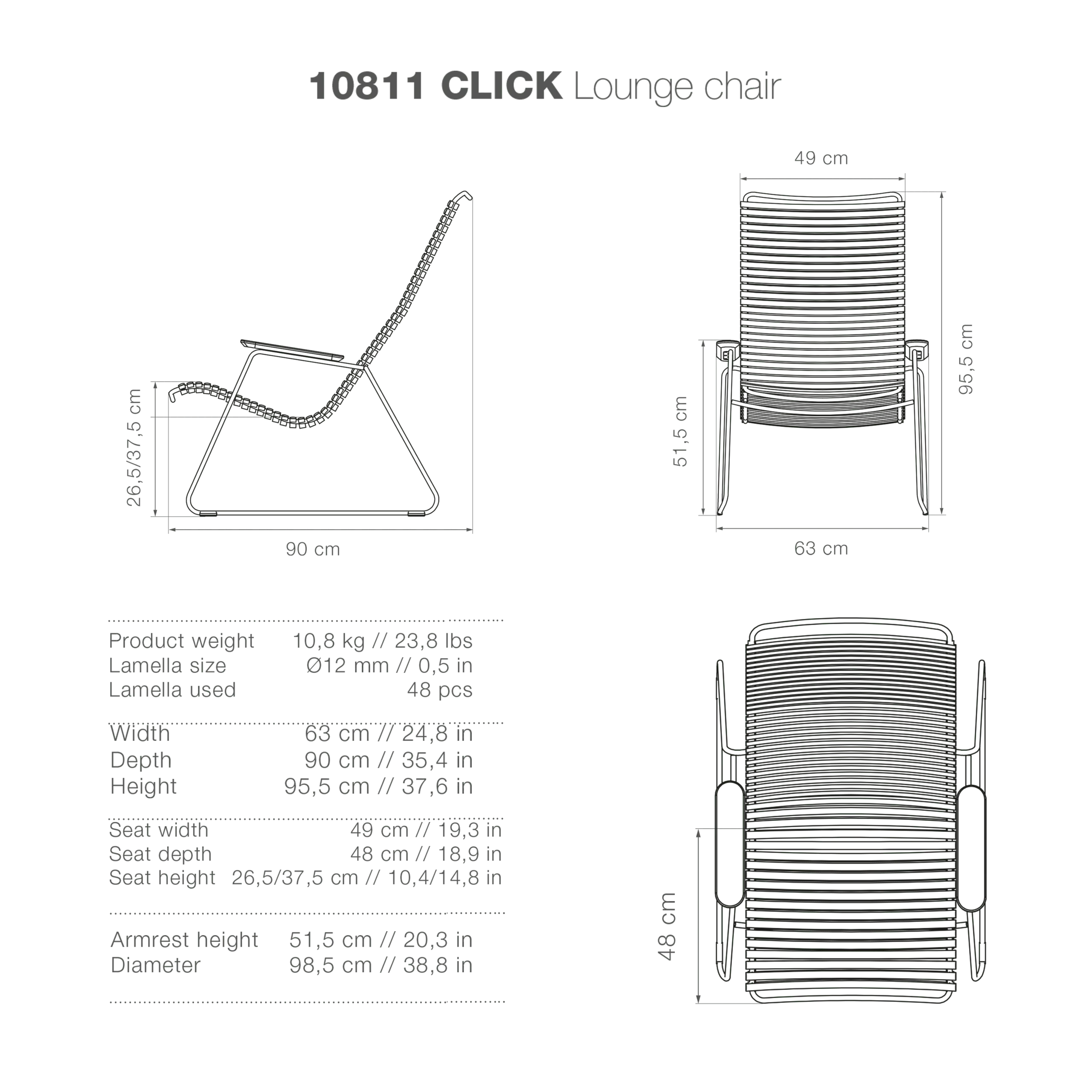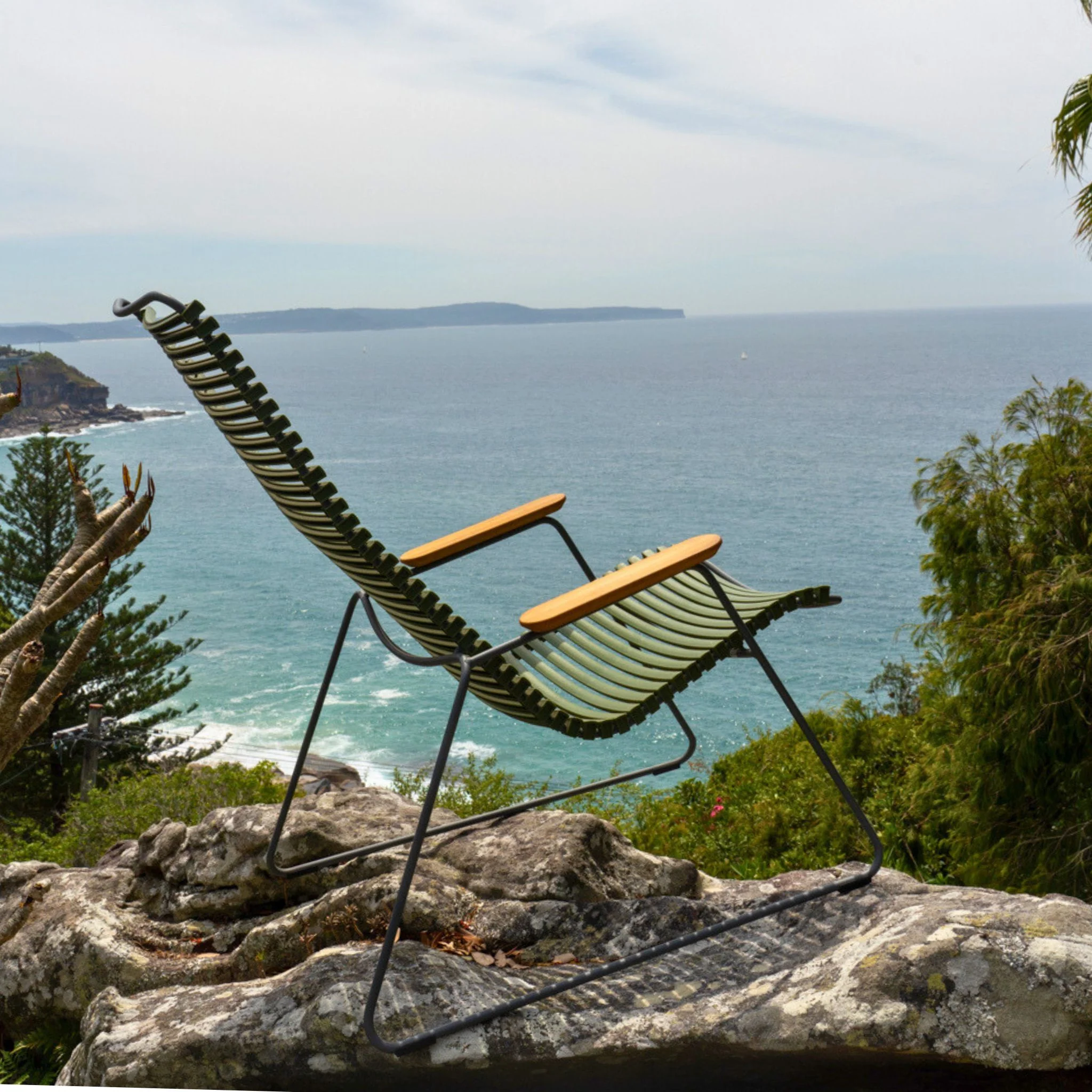 The Click Lounge chair is an extension of Click Rocking chair. The comfort is the same – so for those who are not about to rock, choose the Lounge chair.The Click Lounge chair is made from a solid powder coated steel frame, with ergonomic plastic lamellas which mould to your contour providing support and comfort. The armrests are made from sustainable bamboo laminate. We recommend the Houe Outdoor Oil to maintain the bamboo armrests.