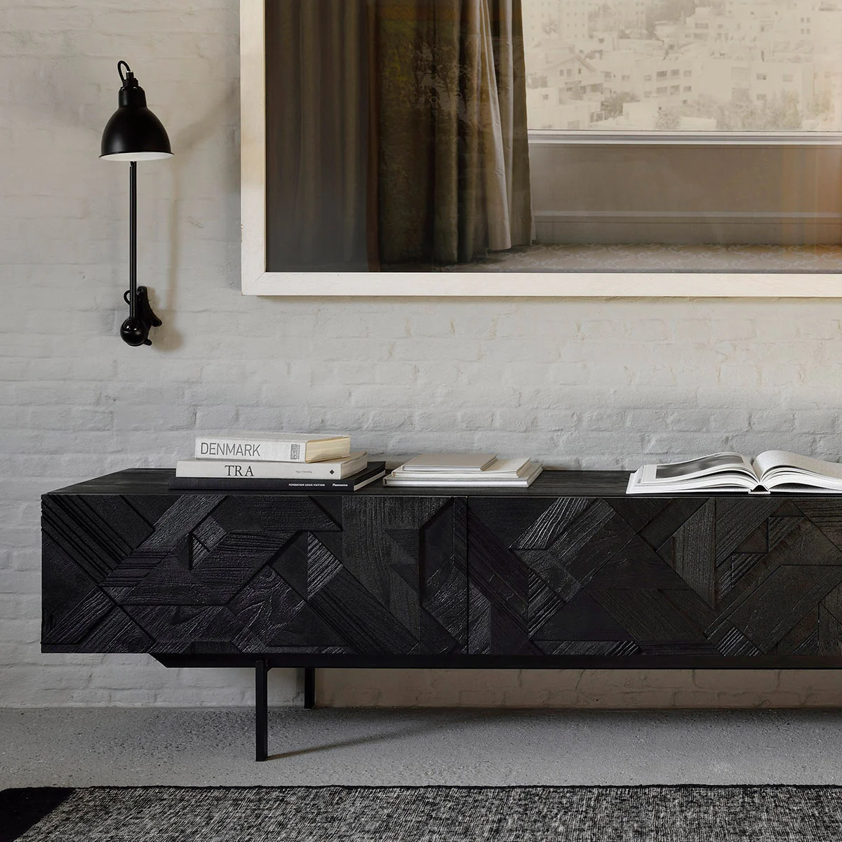 In his quest to add movement to the surface, our designer Alain van Havre started layering and combining triangular shapes. Before he knew it, he had created an interesting composition out of teak. We ended up brushing the surface to highlight the grain and further emphasize the feeling of motion. Originally used for our popular Teak Graphic sideboard, the pattern now translates perfectly to a new TV cupboard.