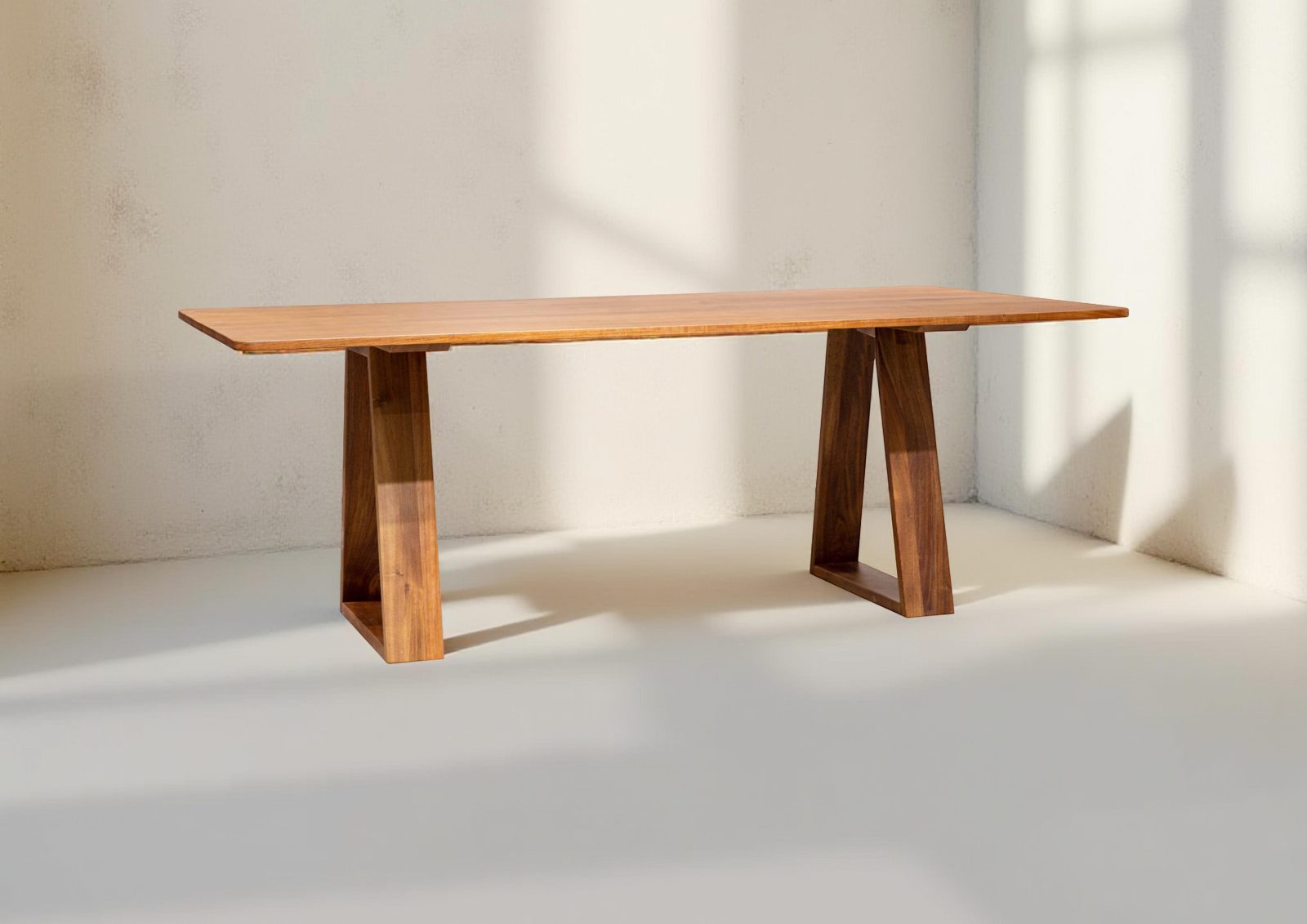 Introducing the Sellicks dining table, a stunning embodiment of Scandinavian design. With its striking delta-shaped legs, this table not only offers sturdy support but also infuses a modern artistic flair into any dining space. Crafted from premium select-grade solid timber, the surface beautifully showcases the intricate wood grain, imbuing each piece with a unique character that adds warmth and depth to your home.