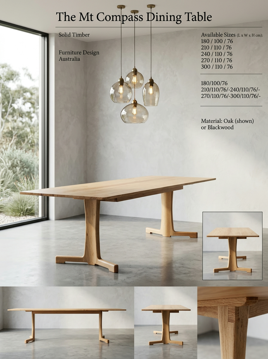 This versatile table not only serves as a functional centrepiece for your dining area, accommodating both daily meals and special occasions, but it also enriches your home’s aesthetic appeal. Its thoughtful design incorporates natural beauty and timeless elegance, making it a seamless fit for both contemporary and traditional interiors. Whether you’re hosting friends or enjoying a quiet meal, the Mt. Compass dining table elevates every experience.