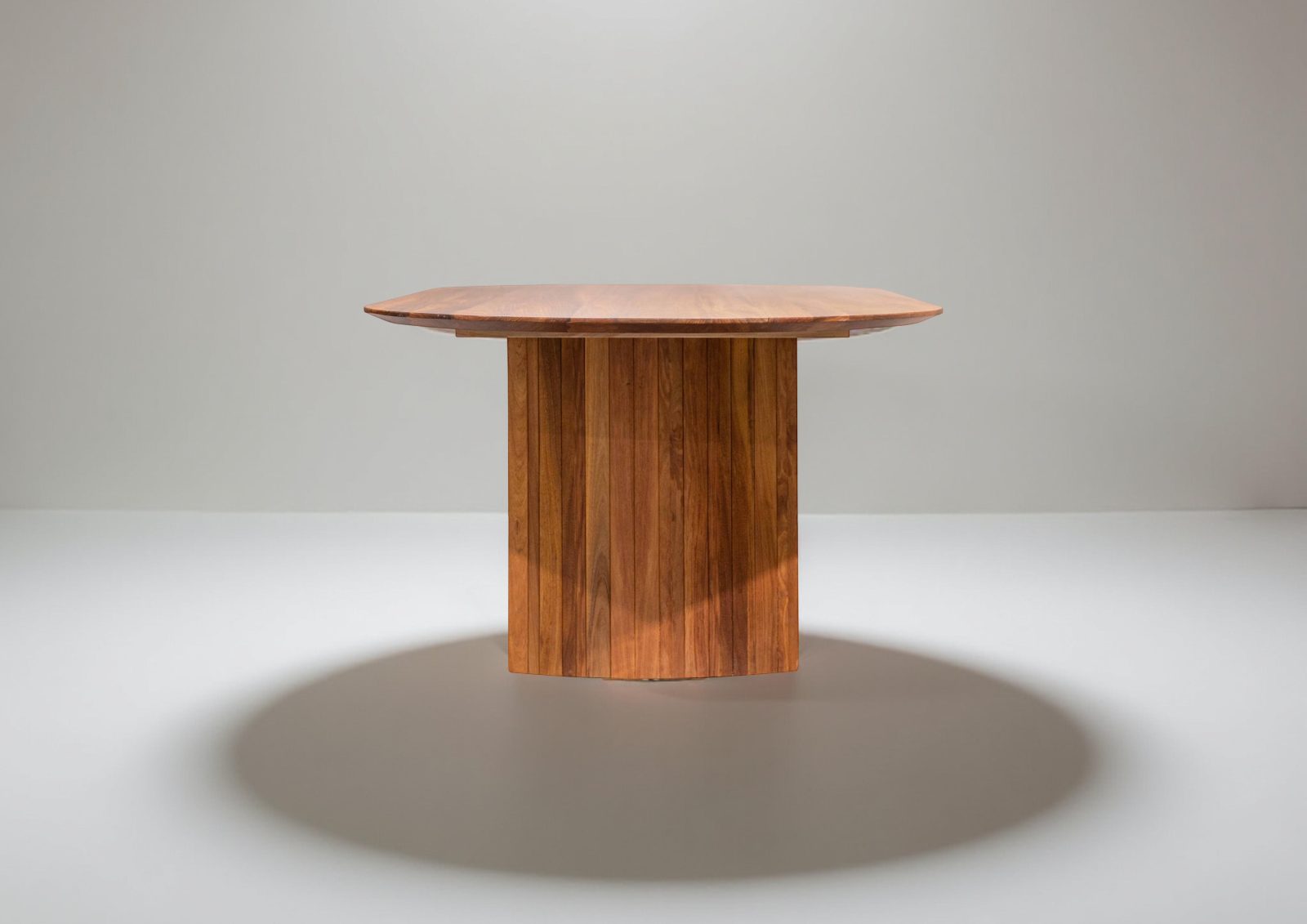 Beneath the tabletop lies a striking barrel-slatted base, meticulously designed to provide exceptional stability while introducing an intriguing design element. The vertical slats of the base create a sense of depth and movement, beautifully contrasting with the gentle curves of the top. This robust construction ensures the table can withstand everyday use, making it perfect for both casual family meals and more formal dining occasions.